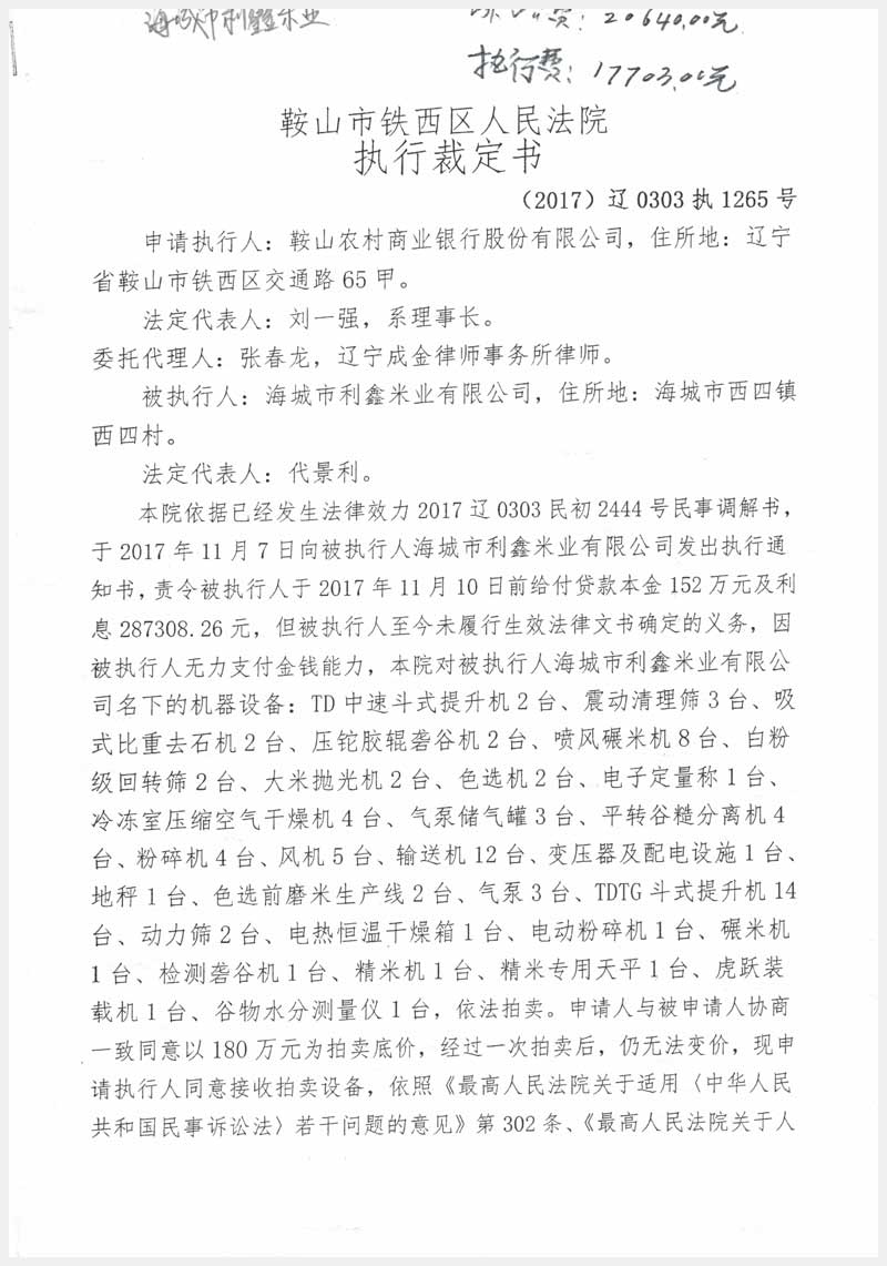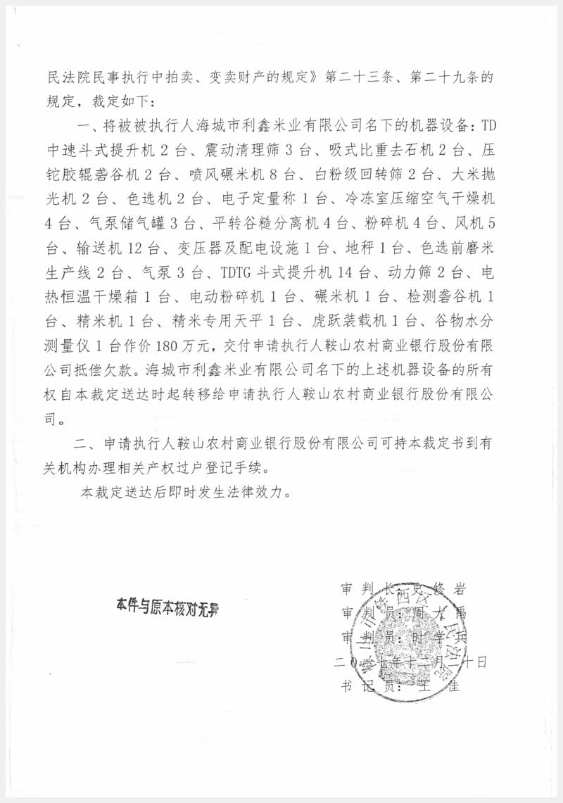 名稱:海城市利鑫米業(yè)有限公司所有的機器設(shè)備 面積:87臺 瀏覽次數(shù):1962